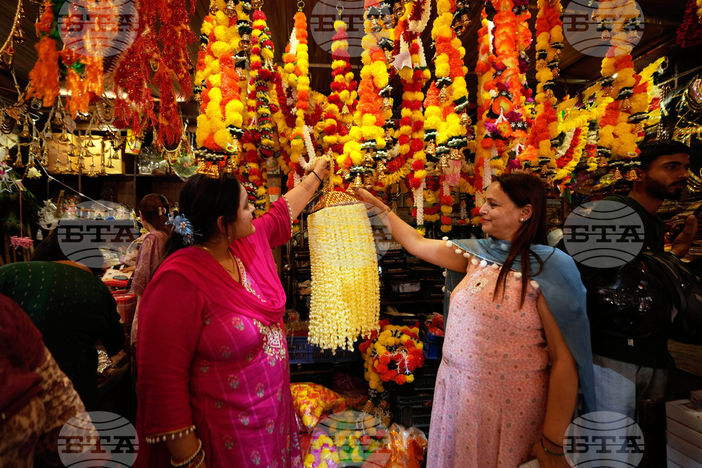 Indian women shop for artificial garlands ahead of the Diwali festival in Jammu, India, Saturday, Oct. 18, 2025. (AP Photo/Channi Anand)