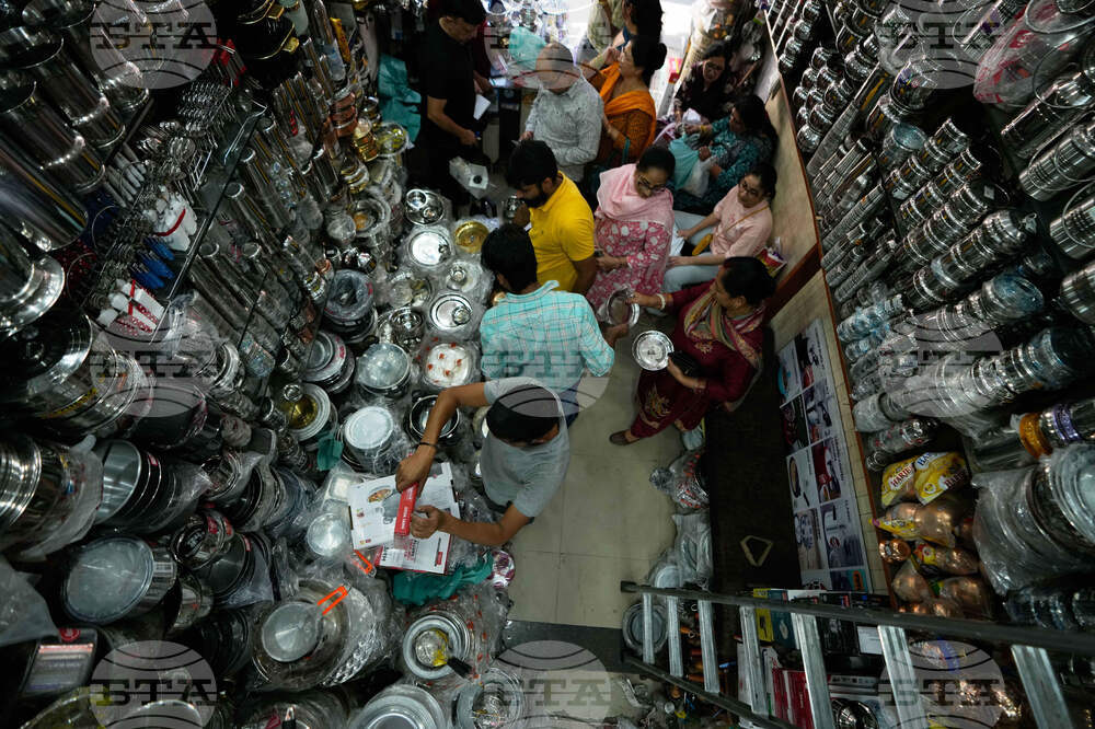 Indian women shop for utensils ahead of the Diwali festival in Jammu, India, Saturday, Oct. 18, 2025. (AP Photo/Channi Anand)
