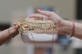 A sales woman shows a gold necklace to a customer on Dhanteras, an auspicious day to purchase gold, silver and utensils and the day that marks the beginning of the Hindu festival of lights Diwali, in Ahmedabad, India, Saturday, Oct. 18, 2025. (AP Photo/Ajit Solanki)
