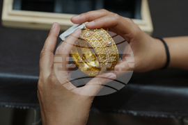 A woman checks gold bangles as she shops on Dhanteras, an auspicious day to purchase gold, silver and utensils and the day that marks the beginning of the Hindu festival of lights Diwali, in Ahmedabad, India, Saturday, Oct. 18, 2025. (AP Photo/Ajit Solanki)