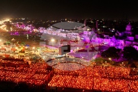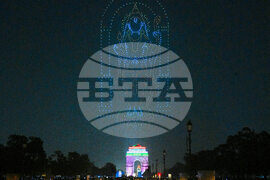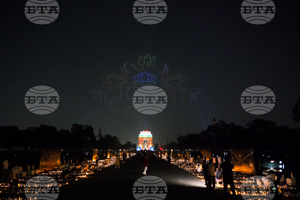 Drones form an image in the sky as volunteers light rows of lamps on Kartavya Path near India Gate as part of the Delhi government's Diwali celebrations in New Delhi, India, Saturday, Oct. 18, 2025. (AP Photo/Deepanshu Aggarwal)