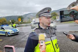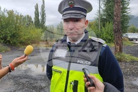 Симитли (18 октомври 2025) На територията на област Благоевград е в ход специализирана полицейска операция по линия на пътната безопасност. На снимката: началникът на група „Организация на движението, пътен контрол и превантивна дейност“ в сектор „Пътна полиция“ при ОДМВР – Благоевград ст. инспектор Георги Бучков дава брифинг за медии край пътен възел „Симитли“.