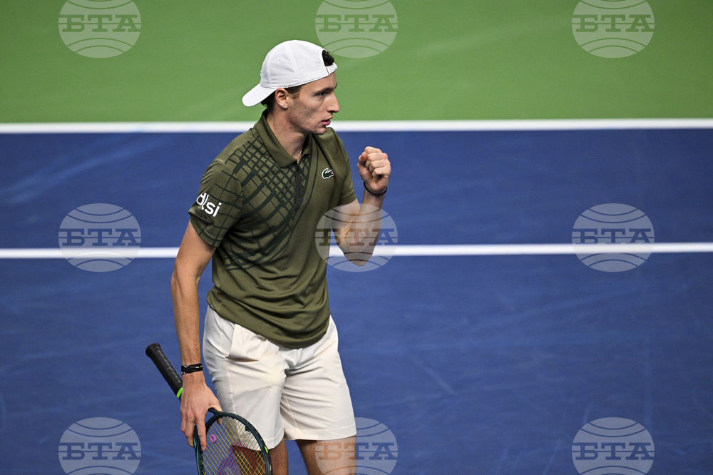 France's Ugo Humbert plays a return to Denmark's Holger Rune in the men's singles semifinal tennis match of the BNP Paribas Nordic Open tennis tournament in Stockholm, Sweden, Saturday, Oct. 18, 2025. (Anders Wiklund/TT via AP)