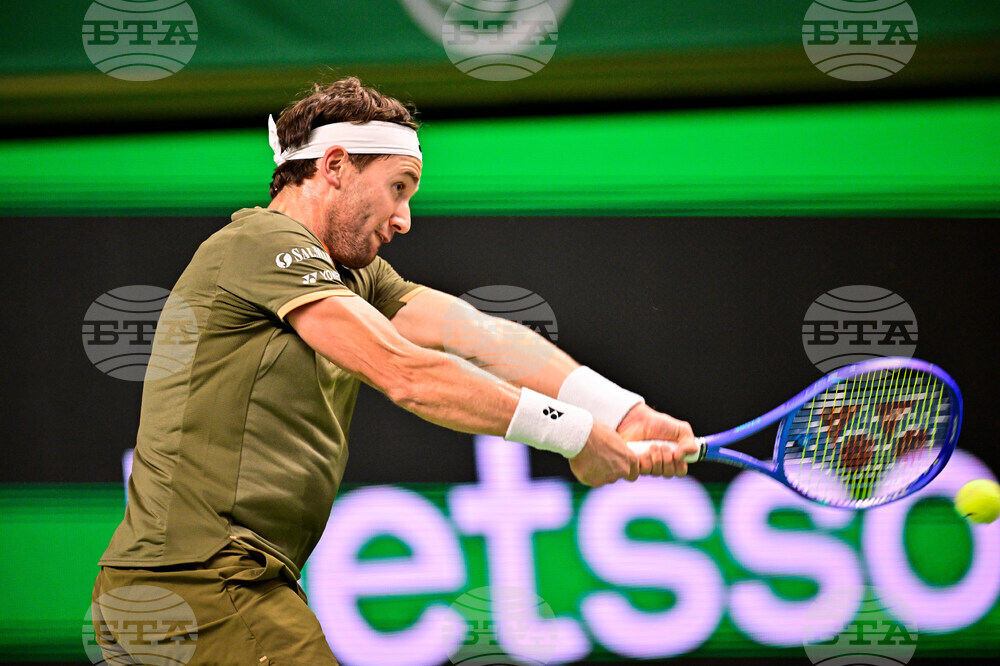 Norway's Casper Ruud hits a return to Canada's Denis Shapovalov during a men's singles semifinal tennis match at the BNP Paribas Nordic Open tennis tournament in Stockholm, Sweden, Saturday, Oct. 18, 2025. (Magnus Lejhall/TT via AP)