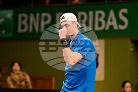 Canada's Denis Shapovalov celebrates during a men's singles semifinal tennis match against Norway's Casper Ruud at the BNP Paribas Nordic Open tennis tournament in Stockholm, Sweden, Saturday, Oct. 18, 2025. (Magnus Lejhall/TT via AP)