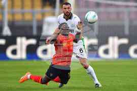 Lecce's Lassana Coulibaly, center, and Sassuolo's Nemanja Matić, right, in action during the Italian Serie A soccer match between Lecce and Sassuolo in Lecce, Italy, Saturday, Oct. 18, 2025. (Giovanni Evangelista/LaPresse via AP)