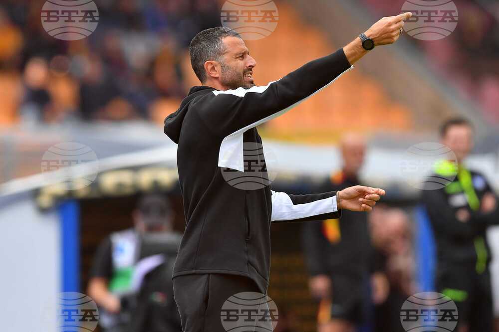 Sassuolo's head coach Fabio Grosso gestures during the Italian Serie A soccer match between Lecce and Sassuolo in Lecce, Italy, Saturday, Oct. 18, 2025. (Giovanni Evangelista/LaPresse via AP)