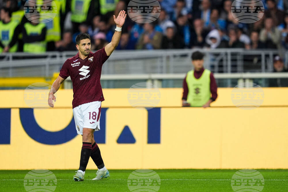 Torino's Giovanni Simeone celebrates after scoring a goal during a Serie A soccer match between Torino FC and Napoli, Saturday, Oct. 18, 2025, in Turin, Italy. (Fabio Ferrari/LaPresse via AP)