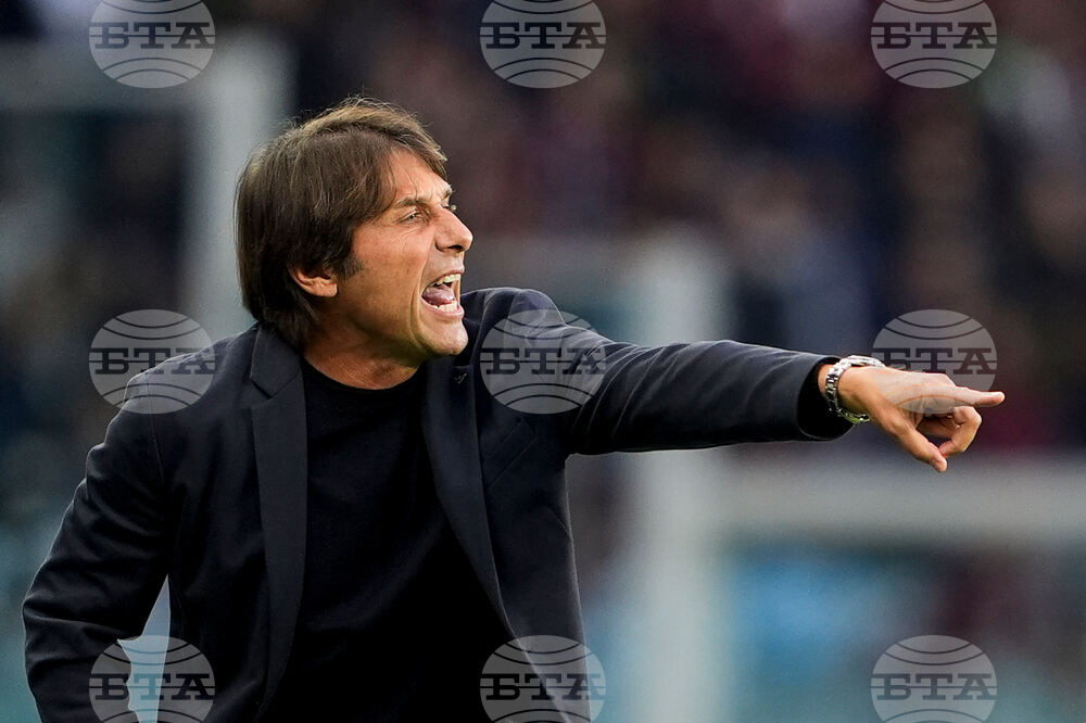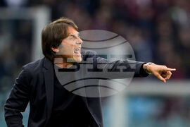 Napoli's head coach Antonio Conte directs his players during a Serie A soccer match between Torino FC and Napoli, Saturday, Oct. 18, 2025, in Turin, Italy. (Fabio Ferrari/LaPresse via AP)