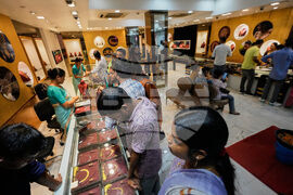 People shop for jewellery on Dhanteras, an auspicious day to purchase gold, silver and utensils and the day that marks the beginning of the Hindu festival of lights Diwali, in Guwahati, Saturday, Oct. 18, 2025. (AP Photo/Anupam Nath)