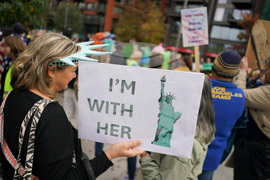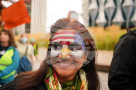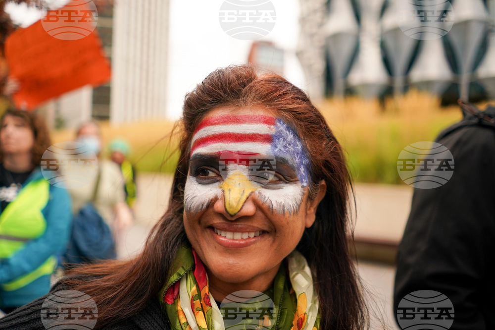 A demonstrator has her face painted with a U.S. flag as she attends a protest outside the U.S. embassy, in London, Saturday, Oct. 18, 2025.(AP Photo/Alberto Pezzali)
