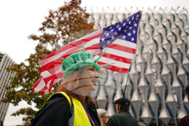 A demonstrator wears an inflatable Statue of Liberty themed hat, against the backdrop of a U.S. flag, during a protest outside the U.S. embassy, in London, Saturday, Oct. 18, 2025.(AP Photo/Alberto Pezzali)