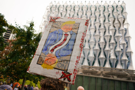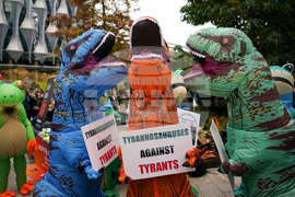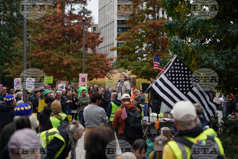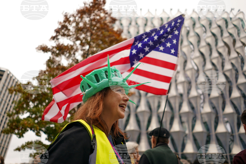 Demonstrators in costumes hold placards during a protest outside the U.S. embassy, in London, Saturday, Oct. 18, 2025.(AP Photo/Alberto Pezzali)