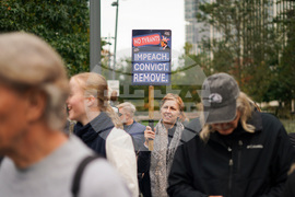 Demonstrators hold placards and flags as they gather during a protest outside the U.S. embassy, in London, Saturday, Oct. 18, 2025.(AP Photo/Alberto Pezzali)