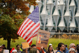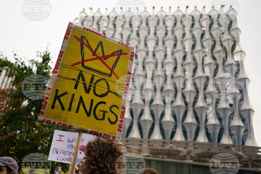 A demonstrator holds a placard against the backdrop of a U.S. flag, during a protest outside the U.S. embassy, in London, Saturday, Oct. 18, 2025.(AP Photo/Alberto Pezzali)
