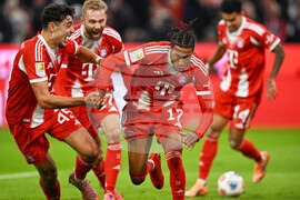 Bayern's Michael Olise, center, celebrates with teammates after scoring his side's second goal during the Bundesliga soccer match between Bayern Munich and Borussia Dortmund in Munich, Germany, Saturday, Oct. 18, 2025. (AP Photo/Lennart Preiss)