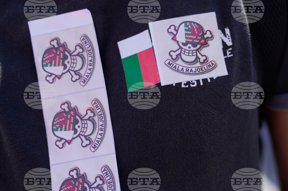 A vendor wears skull and crossbones stickers during a gathering at May 13 Square in Antananarivo, Madagascar, Saturday, Oct. 18, 2025. (AP Photo/Brian Inganga)