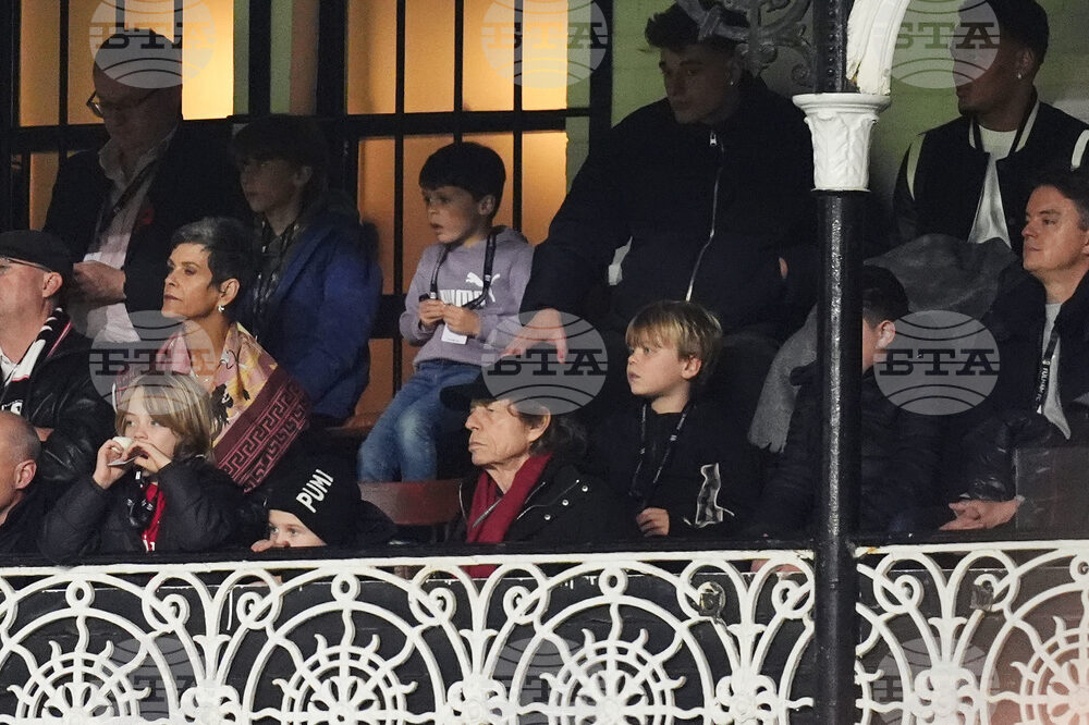 Rolling Stones' Mick Jagger, front center, watches from the stands during an English Premier League soccer match between Fulham and Arsenal, Saturday, Oct. 18, 2025, in London (John Walton/PA via AP)