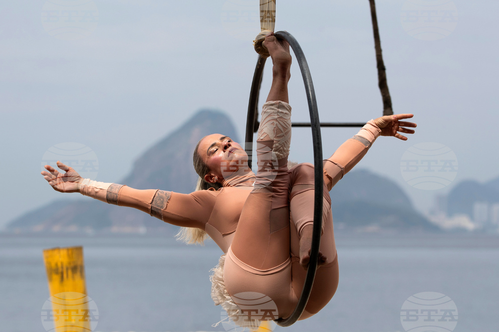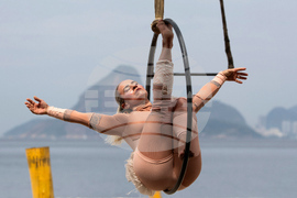 A member of the group aerial circus "Pendurados” performs in an open-air show that explores healing from sexual violence through art and community, at Icarai Beach in Niteroi, Rio de Janeiro state, Brazil, Saturday, Oct. 18, 2025. (AP Photo/Bruna Prado)