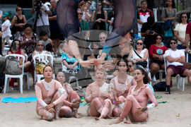 Members of the group aerial circus "Pendurados” perform in an open-air show that explores healing from sexual violence through art and community, at Icarai Beach in Niteroi, Rio de Janeiro state, Brazil, Saturday, Oct. 18, 2025. (AP Photo/Bruna Prado)