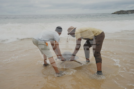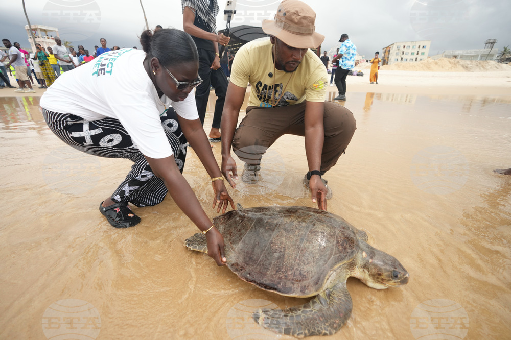 Wildlife conservationist Chinedu Mogbo, left, inspect an endangered sea turtles green before it was released into the Atlantic Ocean in Lagos, Nigeria, Saturday, Oct. 18, 2025, (AP Photo/Sunday Alamba)