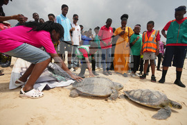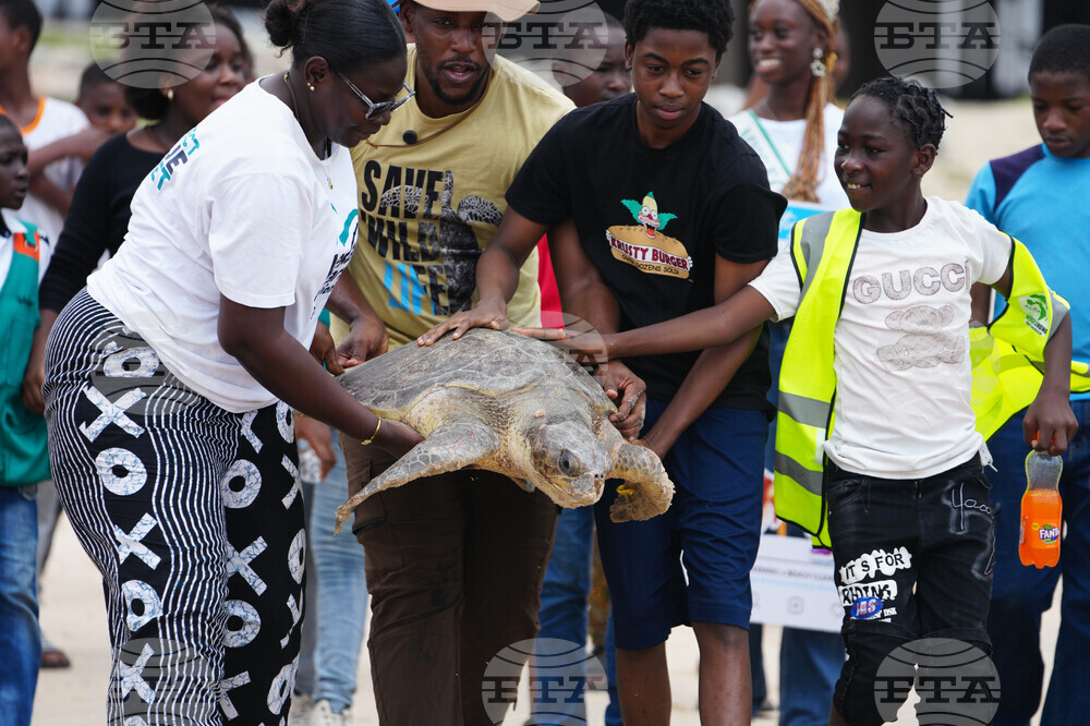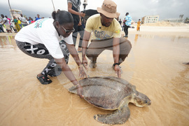 People play with an Olive Ridley sea turtle that was rescued from fishermen before it was released into the Atlantic ocean in Lagos, Nigeria, Saturday, Oct. 18, 2025, (AP Photo/Sunday Alamba)