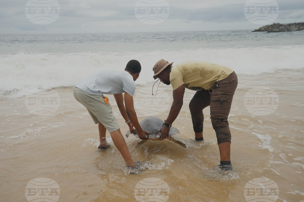Wildlife conservationist, Chinedu Mogbo, right, release an endangered sea turtle, that was rescued from fishermen, into the Atlantic Ocean in Lagos, Nigeria, Saturday, Oct. 18, 2025, (AP Photo/Sunday Alamba)