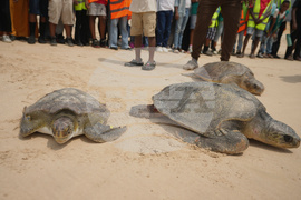 School Children watch two olive Ridley sea turtles, that were rescued from fishermen, being released into the Atlantic ocean in Lagos, Nigeria, Saturday, Oct. 18, 2025, (AP Photo/Sunday Alamba)