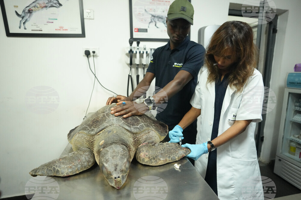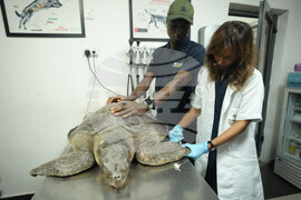 An Olive Ridley endangered sea turtle, rescued from Fishermen, is assessed at a veterinary hospital in Lagos, Nigeria, Saturday, Oct. 18, 2025, (AP Photo/Sunday Alamba)
