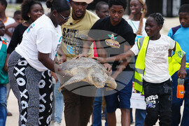School Children watch an endangered sea turtles, that were rescued from fishermen, being released into the Atlantic ocean in Lagos, Nigeria, Saturday, Oct. 18, 2025, (AP Photo/Sunday Alamba)