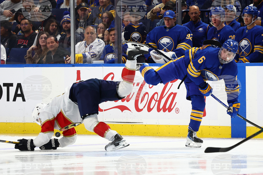 Florida Panthers center Sam Reinhart (13) and Buffalo Sabres left wing Zach Benson (6) collide during the first period of an NHL hockey game Saturday, Oct. 18, 2025, in Buffalo, N.Y. (AP Photo/Jeffrey T. Barnes)