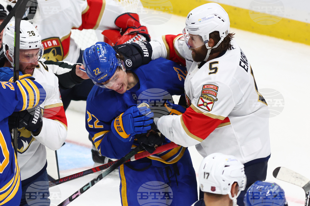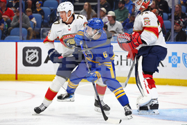 Buffalo Sabres right wing Jack Quinn (22) and Florida Panthers defenseman Aaron Ekblad (5) battle after the whistle during the third period of an NHL hockey game Saturday, Oct. 18, 2025, in Buffalo, N.Y. (AP Photo/Jeffrey T. Barnes)