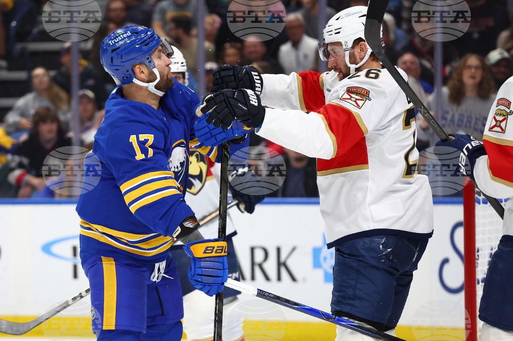 Florida Panthers center Sam Bennett (9) and Buffalo Sabres center Peyton Krebs (19) get tied up during the third period of an NHL hockey game Saturday, Oct. 18, 2025, in Buffalo, N.Y. (AP Photo/Jeffrey T. Barnes)