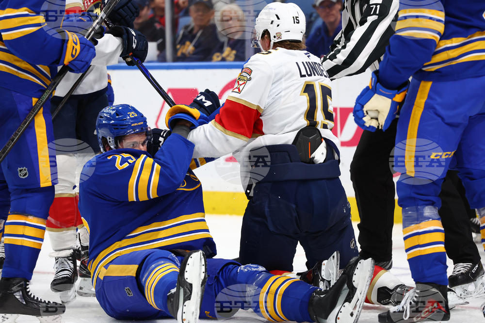 Buffalo Sabres defenseman Owen Power (25) and Florida Panthers center Anton Lundell (15) grab on to each other during the second period of an NHL hockey game Saturday, Oct. 18, 2025, in Buffalo, N.Y. (AP Photo/Jeffrey T. Barnes)