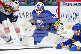 Buffalo Sabres goaltender Alex Lyon (34) watches the puck during the second period of an NHL hockey game against the Florida Panthers Saturday, Oct. 18, 2025, in Buffalo, N.Y. (AP Photo/Jeffrey T. Barnes)