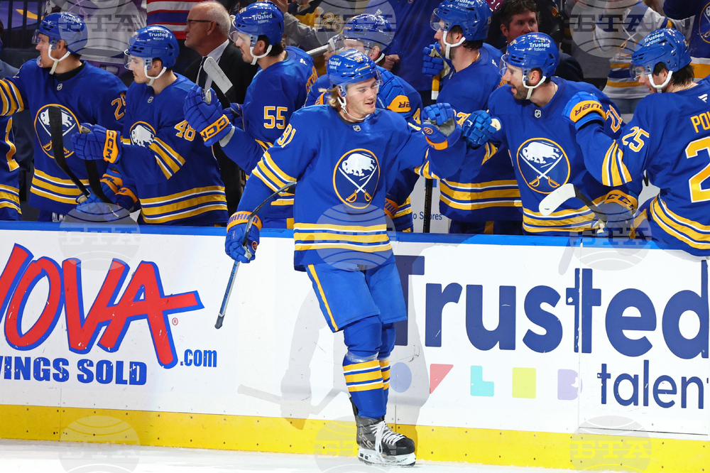 Buffalo Sabres right wing Josh Doan (91) celebrates his goal with teammates during the second period of an NHL hockey game against the Florida Panthers, Saturday, Oct. 18, 2025, in Buffalo, N.Y. (AP Photo/Jeffrey T. Barnes)