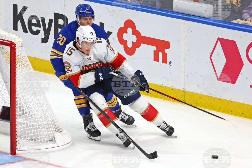 Florida Panthers center Anton Lundell (15) is pressured by Buffalo Sabres center Jiri Kulich (20) during the third period of an NHL hockey game Saturday, Oct. 18, 2025, in Buffalo, N.Y. (AP Photo/Jeffrey T. Barnes)