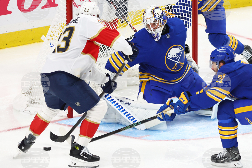 Florida Panthers defenseman Niko Mikkola (77) and Buffalo Sabres left wing Zach Benson (6) battle for position in front of goaltender Sergei Bobrovsky (72) during the first period of an NHL hockey game, Saturday, Oct. 18, 2025, in Buffalo, N.Y. (AP Photo/Jeffrey T. Barnes)