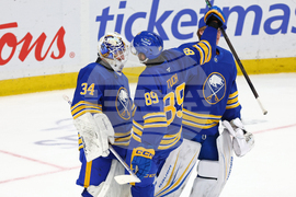 Buffalo Sabres center Tage Thompson (72) and goaltender Alex Lyon (34) celebrate a victory over the Florida Panthers following an NHL hockey game Saturday, Oct. 18, 2025, in Buffalo, N.Y. (AP Photo/Jeffrey T. Barnes)