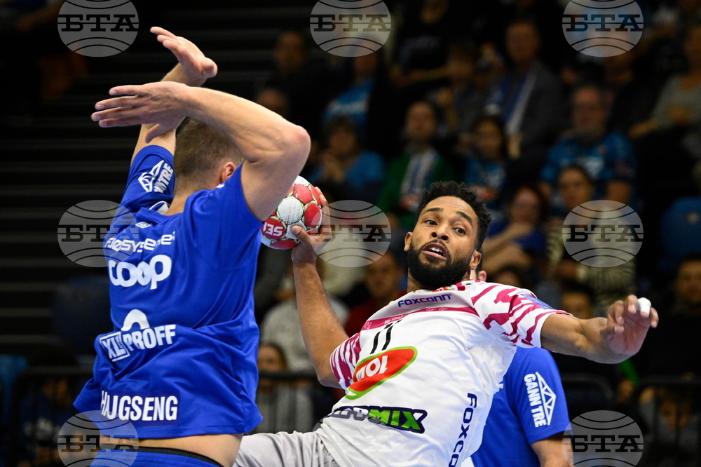 Baptiste Damatrin, right, of Tatabanya in action against Andreas Horst Haugseng of Naerbo during the EHF men's handball European Cup Round 2, second leg match of MOL Tatabanya KC of Hungary vs Naerbo ILof Norway in Tatabanya, western Hungary, Saturday, Oct. 18, 2025. (Boglarka Bodnar/MTI via AP)