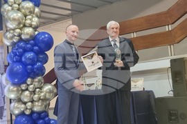 Плевен (18 октомври 2025) В галерия "Илия Бешков" се състоя церемония по връчване на наградата "Лекар на годината 2025" за Плевенска област. Тя се организира от Районната лекарска колегия (РЛК) в Плевен. На снимката: проф. д-р Евлоги Маринов (вдясно) е носител на наградата в категория “Дългогодишна дейност в областта на медицината и активен принос в развитието на специалността“, връчена му от д-р Кирил Недялков, председател на РЛК - Плевен.