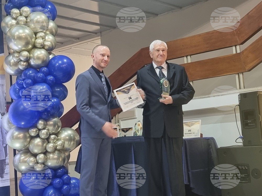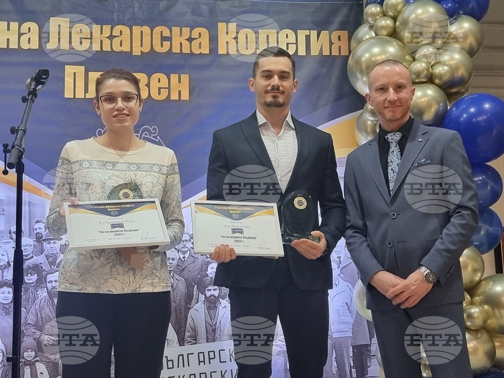 Плевен (18 октомври 2025) В галерия "Илия Бешков" се състоя церемония по връчване на наградата "Лекар на годината 2025" за Плевенска област. Тя се организира от Районната лекарска колегия (РЛК) в Плевен. На снимката: двама млади лекари - д-р Кристина Пеева и д-р Ивайло Боев получиха наградата "Ти си нашето бъдеще", от д-р Кирил Недялков (вдясно), председател на РЛК - Плевен.