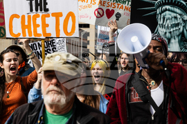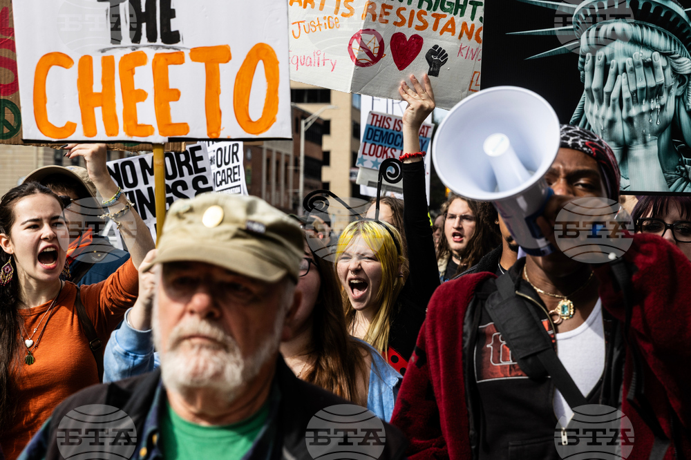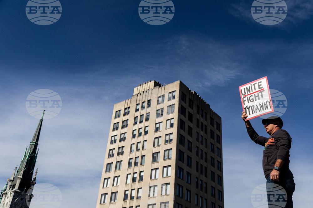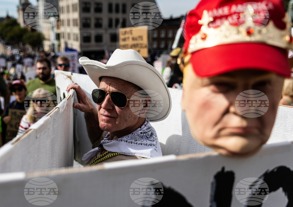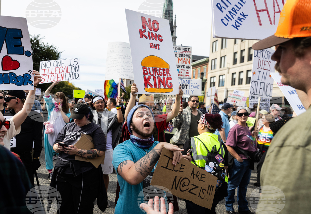 People participate in a "No Kings" protest at the Pennsylvania Capitol steps in Harrisburg, Pa., on Saturday, Oct. 18 2025. (Sean Simmers/The Patriot-News via AP)