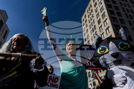 People dressed as Benjamin Franklin, left, and the Statue of Liberty, center, and a cat participate in a "No Kings" protest at the Pennsylvania Capitol steps in Harrisburg, Pa., on Saturday, Oct. 18 2025. (Sean Simmers/The Patriot-News via AP)