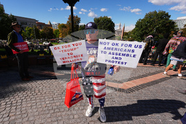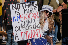 Dressed as Betsy Ross, Jordan Jansson of Denver waves a placard during a rally and march through the streets Saturday, Oct. 18, 2025, in Denver. (AP Photo/David Zalubowski)