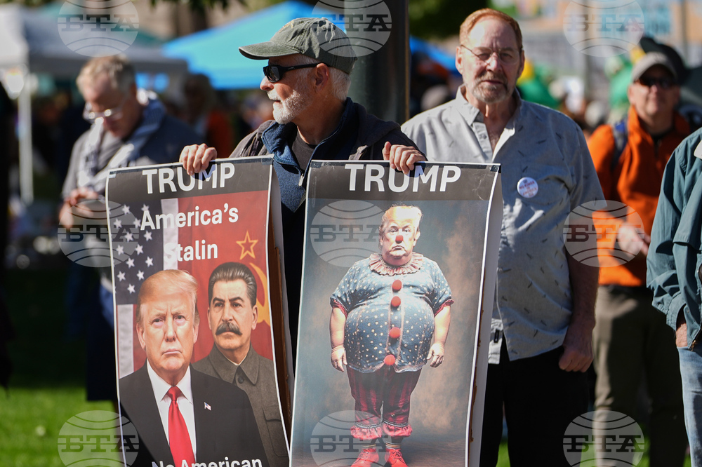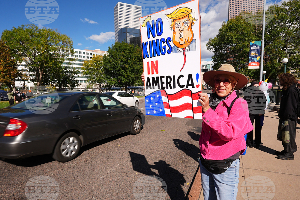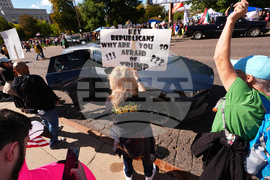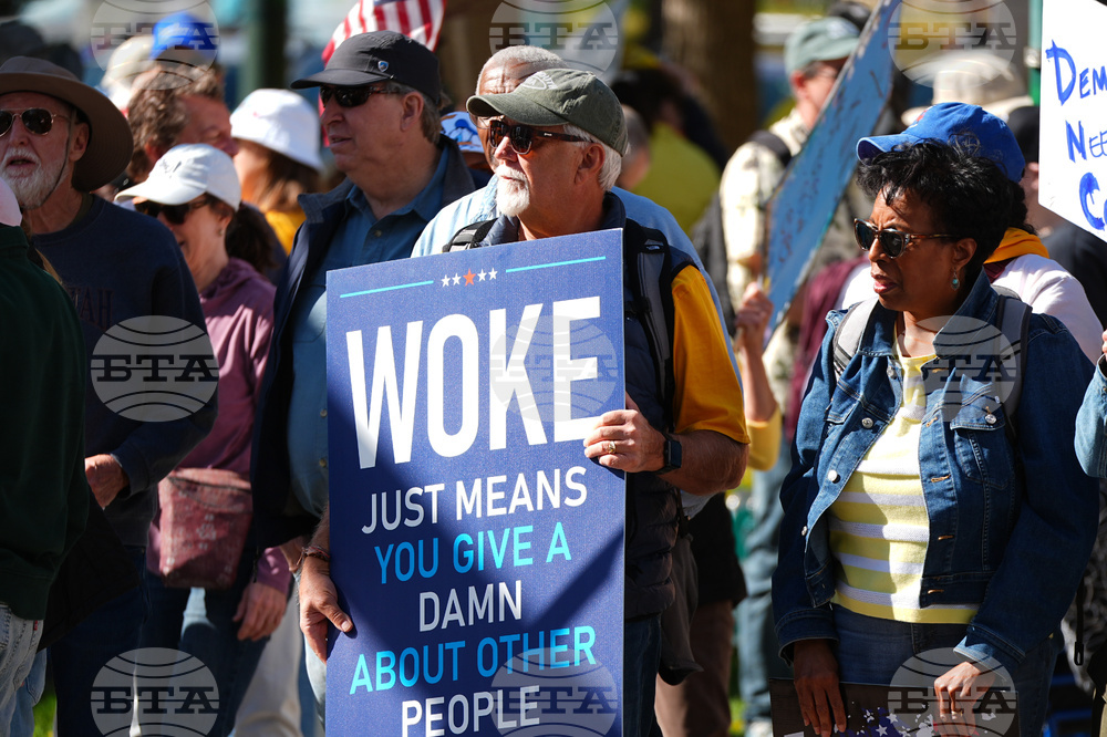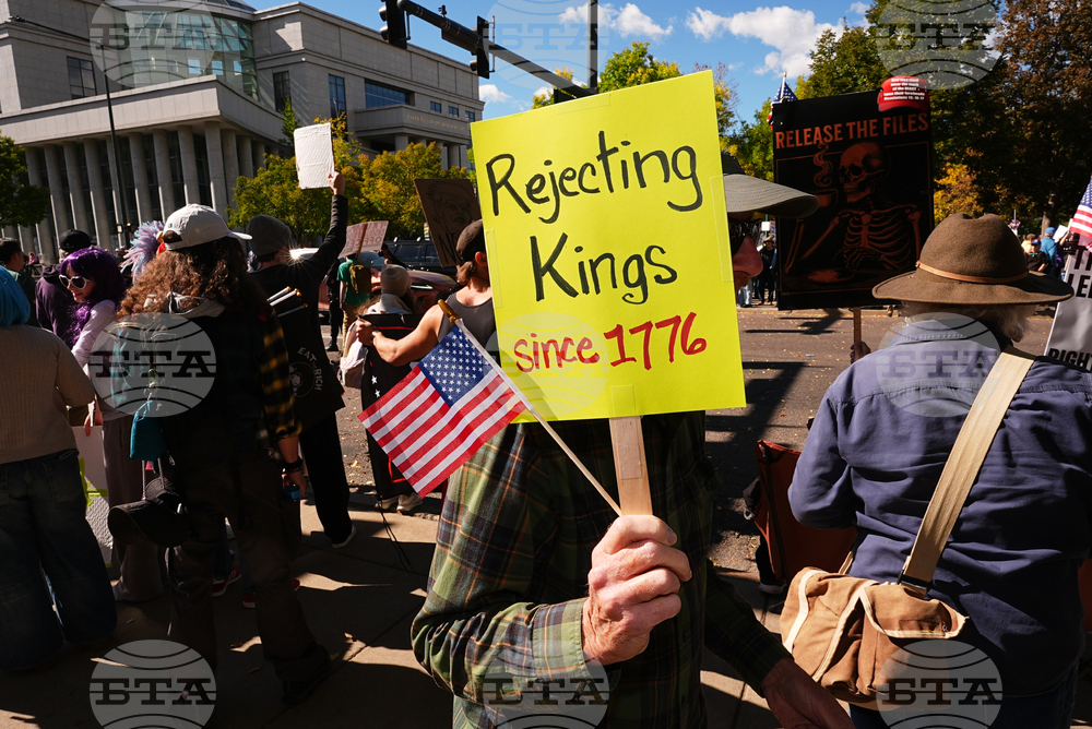 Rallygoer holds placard during a rally and march through the streets in Denver, on Saturday, Oct. 18, 2025. (AP Photo/David Zalubowski)