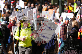 Rallygoer hols up placard during a rally and march through the streets Saturday, Oct. 18, 2025, in Denver. (AP Photo/David Zalubowski)