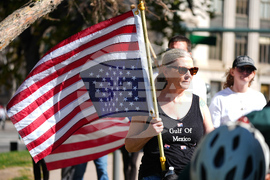 Melissa Mortimier of Denver waves a sign and flag during a rally and march through the streets Saturday, Oct. 18, 2025, in Denver. (AP Photo/David Zalubowski)