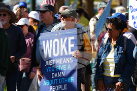 Amy Jones, a small businessowner and two-time cancer survivor from Denver, holds a placard during a rally and march through the streets Saturday, Oct. 18, 2025, in Denver. (AP Photo/David Zalubowski)