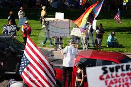 A person holds an American flag during a "No Kings" protest Saturday, Oct. 18, 2025, in Denver. (AP Photo/David Zalubowski)